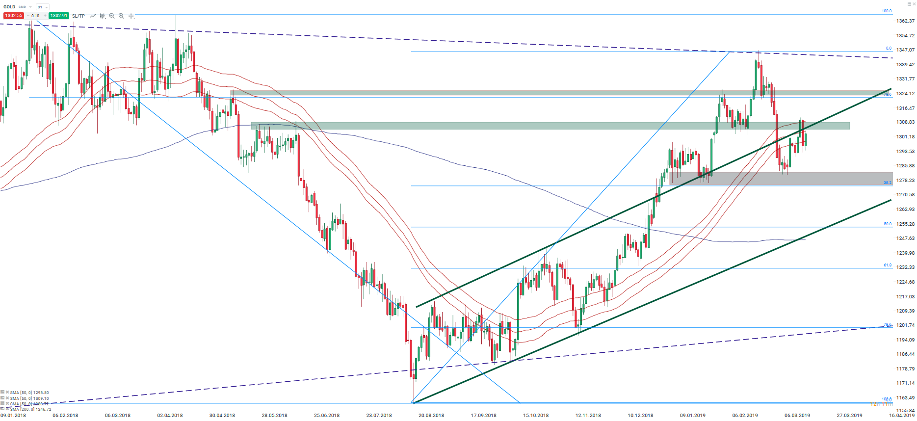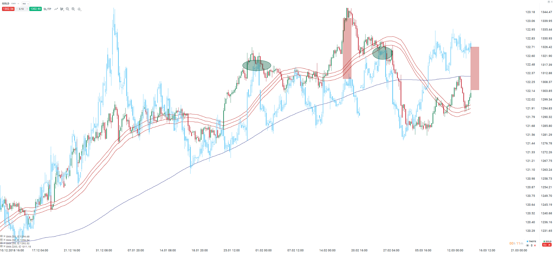 Nakonec si můžeme ještě porovnat cenové změny na H4 s vývojem ceny desetiletých bondů (TNOTE - modrý graf). Můžeme vidět, že poslední pokles výnosů (růst ceny TNOTE) nepomohl zlatu na vyšší hodnoty. Před výprodejem z konce února měly americké dluhopisy problém se vyšvihnout na nová maxima, zatímco zlato atakovala úroveň 1350 dolarů. Aktuálně se TNOTE obchodují výše, zatímco zlato má stále problém s třináctistovkovou hladinou. Z tohoto pohledu má zlato docela výrazný prostor k růstu. Navíc se cena dostala nad kanál 50 období klouzavých průměrů na H4 a býci ho ubránili během dalšího testu těchto úrovní. Takže když si to shrneme, tak býci by se mohli pokusit vytáhnout cenu zlata k úrovni rezistence na denním grafu - do blízkosti 1311 dolarů za unci.