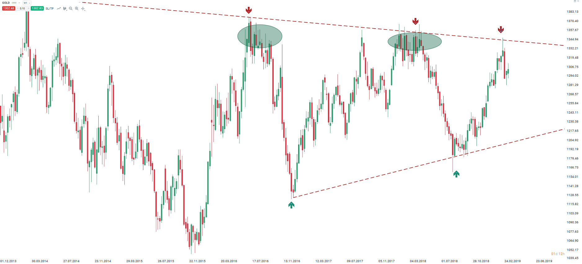 - Zlato se odrazilo zpět od horní limity trojúhelníkové formace