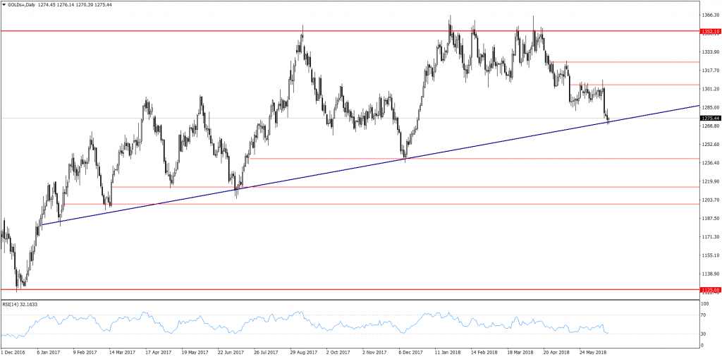 Jastrabí FED poslal v minulom týždni nadol cenu zlata. To sa aktuálne obchoduje pri úrovni 1275 USD za uncu. Táto úroveň je zaujímavá tým, že tesne pri spodnej hrane rastovej trojuholníkovej formácie. Jej spodná hrana je prítomná od začiatku roka 2017, odkedy zastavila už tri poklesy ceny zlata. Jej horná hrana, teda rezistencia okolo úrovne 1350 USD je dokonca prítomná od leta 2016. Jedná sa teda o dlhodobé technické formácie.