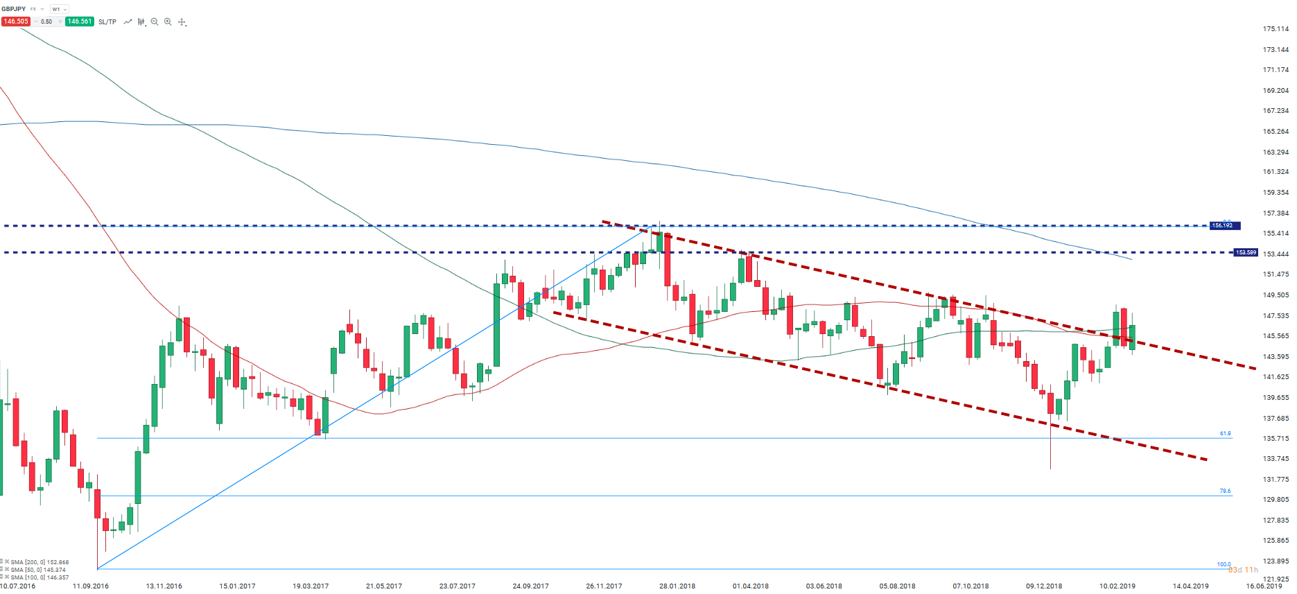 Počas predchádzajúcich dvoch týždňov sme mohli vidieť nárast volatility GBP, kvôli brexitu. Britská libra vymazala časť predchádzajúcich ziskov. GBPJPY zaznamenal pokles k vrchnej línii rastového trendového kanála. Tento pohyb môžeme vnímať ako opätovné testovanie rezistencie, ktorú menový pár prerazil a teraz slúži ako úroveň supportu. Menový pár by sa mohol od tejto úrovne odraziť smerom nahor. GBPJPY sa obchoduje nad 50 a 100 – týždňovým kĺzavým priemerom, čo možno považovať za znak dominancie na strane dopytu.