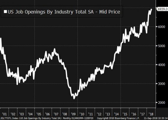 Napríklad počet voľných pracovných miest v júli dosiahol nové maximum (dáta sa zbierajú od roku 2000) 6,9 mil. (@TheStalwart):