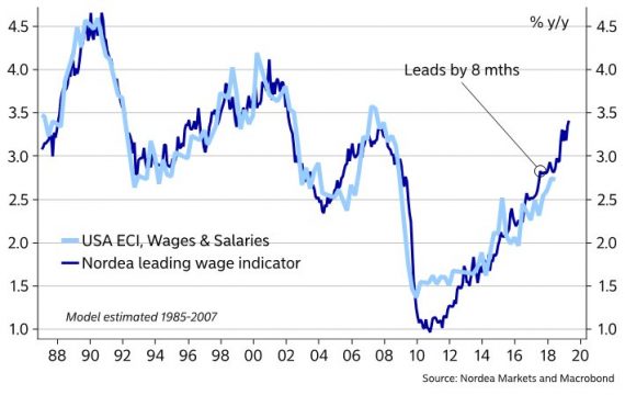 Prostredie pre rast miezd v USA je teda dobré. Ukazuje to aj indikátor od banky Nordea, ktorý je pozliepaný z viacerých indikátorov z trhu práce (vrátane tých, ktoré som spomenul vyššie). Podľa tohto ukazovateľa by sa v najbližších mesiacoch mohol dostať rast miezd vyššie nad tri percentá (@MikaelSarwe):