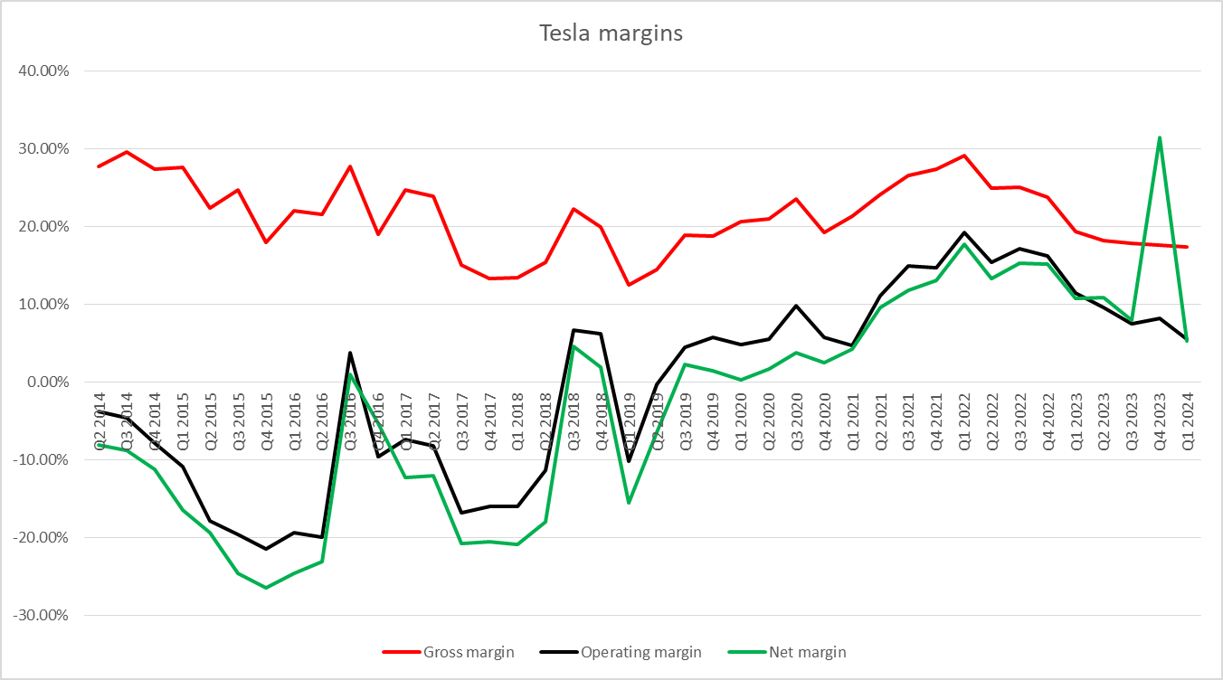 Výsledky Tesly za 1. čtvrtletí 2024 byly celkově slabší. Společnost oznámila, že došlo k prvnímu meziročnímu poklesu tržeb od 2. čtvrtletí 2020, zatímco tržby v nominální hodnotě byly nejnižší od 2. čtvrtletí 2022. Hrubý zisk, provozní zisk a čistý zisk nesplnily očekávání a ve srovnání s předchozím rokem výrazně poklesly.