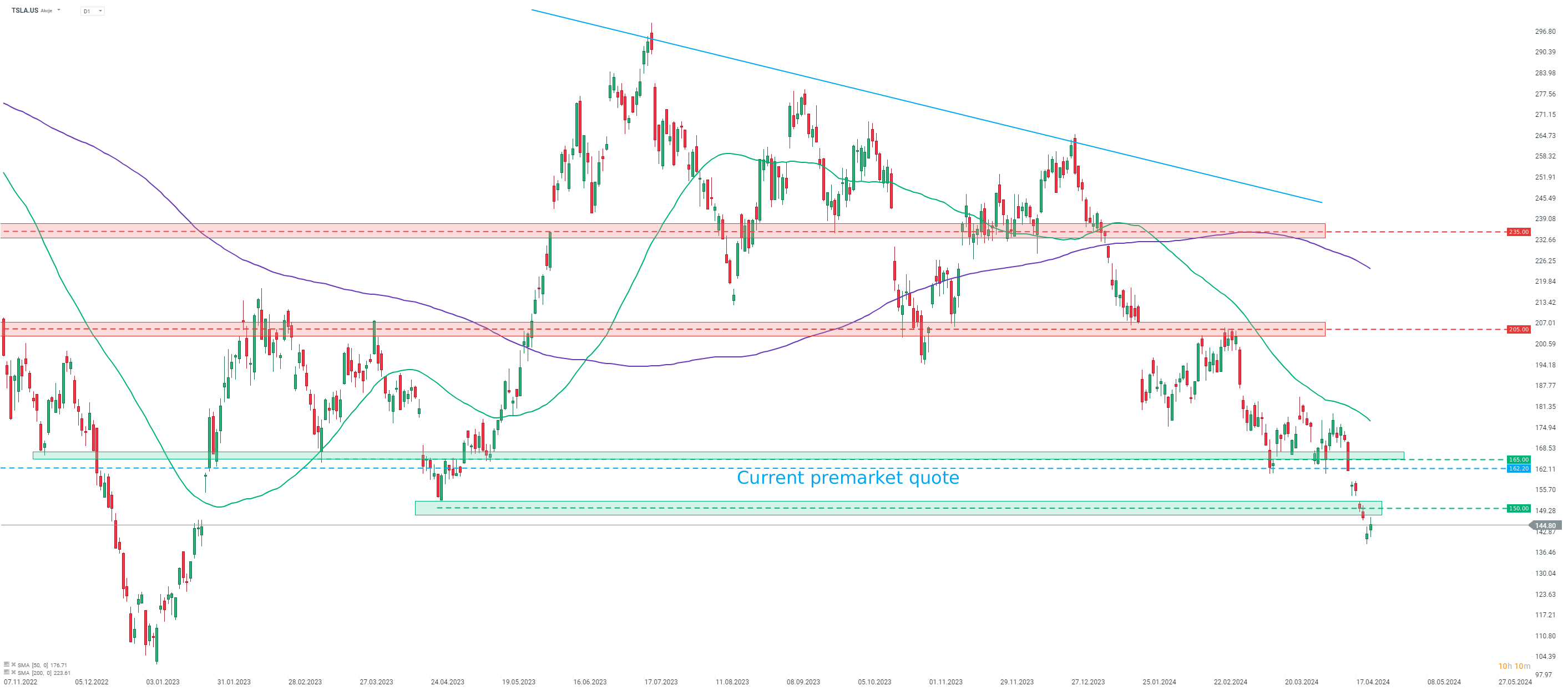 Tesla (TSLA.US) se v premarketu obchoduje o více než 12 % výše, a to i přes zveřejnění neuspokojivé zprávy za 1. čtvrtletí 2024. Pokyny nabízené společností byly vágní a postrádaly podrobnosti, ale nezdá se, že by investoři byli znepokojeni. Zdroj: xStation5