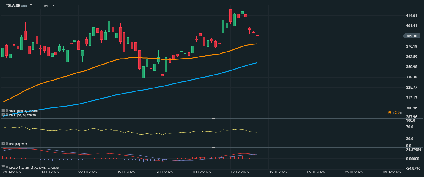 Akcie společnosti Tesla se aktuálně obchodují kolem úrovně 389,30 EUR, kde dochází ke krátkodobé korekci po předchozím prudkém růstu. Cena se stále drží nad klouzavými průměry EMA 50 (379,38 EUR) a SMA 100 (365,08 EUR), což značí zachované býčí nastavení. RSI osciluje na hodnotě 51,7, tedy v neutrálním pásmu, což ukazuje na vyváženost mezi nabídkou a poptávkou, ale zároveň není zatím varováním před přeprodaností ani překoupeností.