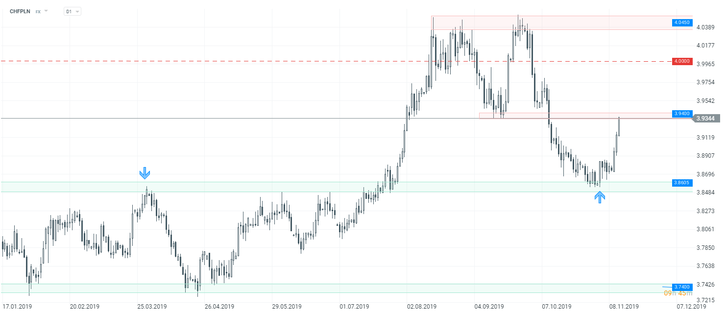 - CHFPLN se odrazil od klíčové zóny rezistence na 3,86 PLN