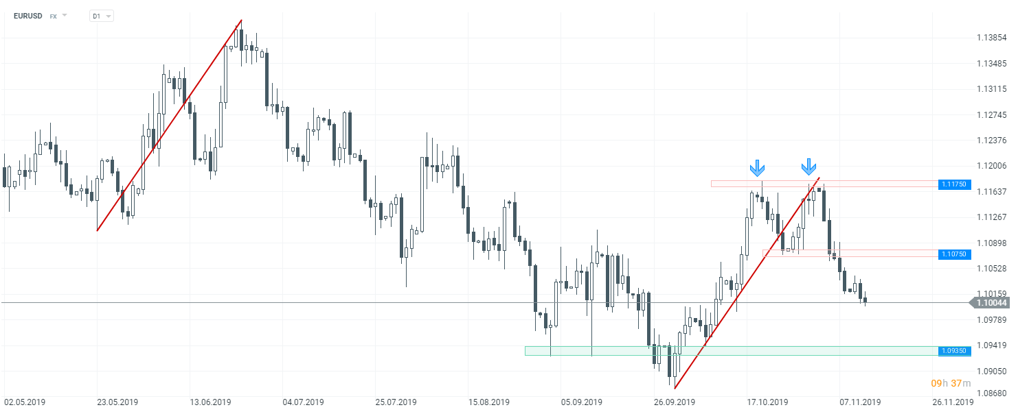 - Na páru EURUSD vidíme formaci dvojitého vrcholu na D1 grafu