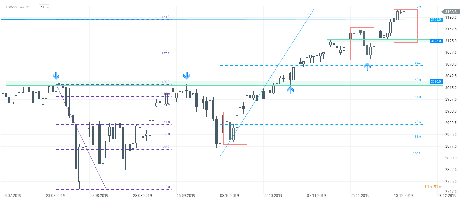 Oči býků září při pohledu na poslední vývoj indexu US500. Rostoucí trend na amerických akciích zůstává v platnosti a nové historické rekordy jsou překonávány takřka každou seanci. Poslední korekce byla ukončena na spodní limitě struktury Ovebalance 1:1 a odraz index zavedl až na 3080 bodů, kde trh vytvořil nová maxima. Průraz nad 161,8 % Fibo externí úroveň poslední výraznější korekce jen potvrdil býčí sentiment. Z trhu zmizela významnější rizika a nevypadá tak příliš pravděpodobně, že by se situace v brzké době měla měnit. Obchodníci však nesmí zapomínat ani na korekce "z vyčerpání". V případě výběru zisků by se měli soustředit na úroveň 3126 bodů - spodní limita 1:1 tržní geometrie.