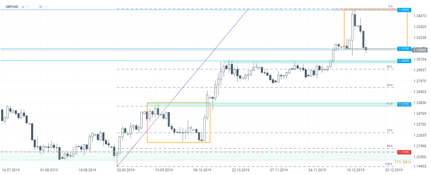 Při pohledu na graf GBPUSD je patrné, že se pár odrazil zpět od úrovně 1,35 zpět na úrovně, které byly platné před zveřejněním výsledků britských parlamentních voleb (1,32) a směřuje dále na nižší úrovně. Cena dnes dosáhla na klíčový support ohraničený spodní limitou struktury Overbalance. Pokud by se býci rozhodli postavit sílícímu tlaku na pokles, mohlo by se tak stát na této úrovni. Zatím to však vypadá, že medvědi zůstávají v převaze a obchodníci by měli začít vnímat také úroveň podpory na hladině 1,30.