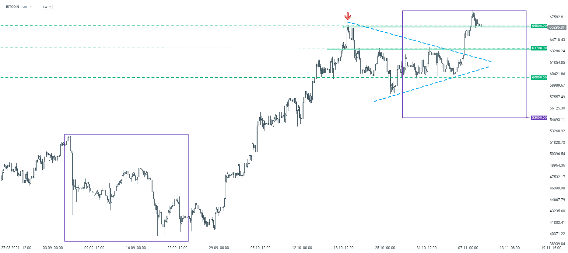 Na H4 grafu Bitcoinu vidíme průraz nad horní limitu trojúhelníkové formace a dosažení historického maxima. Nicméně cena následně korigovala a otestovala již proražené ATH v blízkosti $66 500. Pokud cena zůstane nad touto úrovní, tak rostoucí trend může pokračovat. Na druhou stranu průraz pod ní může vést k hlubší klesající korekci. V případě tohoto scénáře leží nejbližší support na $63 700. Je důsledkem předchozích cenových reakcí. Nicméně širší pohled na současnou situaci ukazuje, že střednědobý support leží na $55 000, kde se nachází spodní limita struktury1:1 (fialové obdélníky). Obchodníci by také měli sledovat chování Bitcoinu v blízkosti psychologické úrovně $60 000, která v minulosti hrála roli supportu.