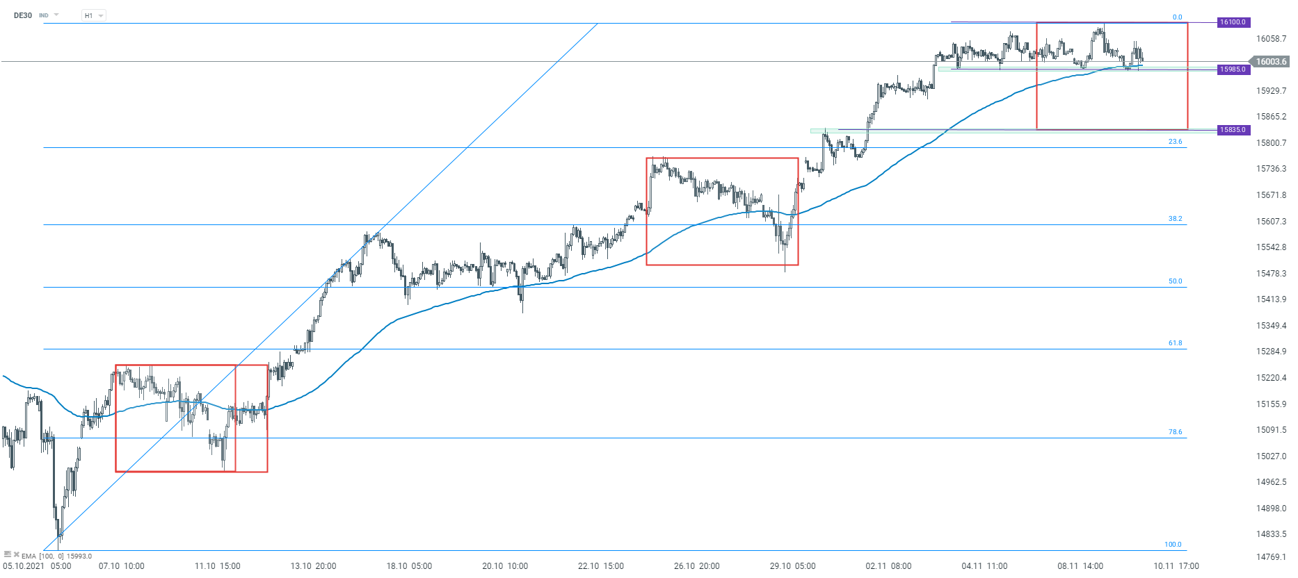 Pohled na denní časový rámec DAX (DE30) ukazuje zpomalující růstové momentum. Index včera dosáhl na čerstvá maxima, ale býci se velmi rychle vzdali dalších cenových zisků. Hlavním supportem je nyní oblast spodní limity obchodního rozpětí na úrovní 15 950 bodů. Pokud se cena udrží nad touto úrovní, tak býci mají šanci obnovit rostoucí trend. Naopak její průraz by vydláždil cestu k hlubší korekci. Pokud vezmeme v úvahu medvědí scénář, tak další potenciální support leží na 15 835 bodech. Tam se nachází spodní limita 1:1 struktury.