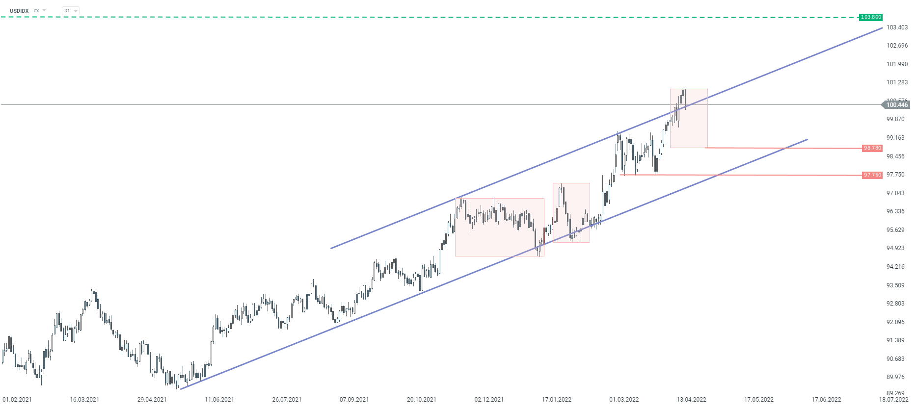 Na závěr se podívejme na graf dolarového indexu (USDIDX), který se pohybuje v silně rostoucím trendu. Při pohledu na graf D1 se ceně podařilo prorazit nad horní hranici vzestupného kanálu, přesto dnes došlo ke pullbacku. Pokud cena klesne pod horní hranici kanálu, bude možná korekce směrem dolů. Vzhledem k takovému scénáři by úroveň 98,78 měla být považována za nejbližší support. Tato úroveň se shoduje se spodní hranicí struktury 1:1. Pokud však pohyb směrem dolů akceleruje, další support se nachází o něco níže – na 97,75.