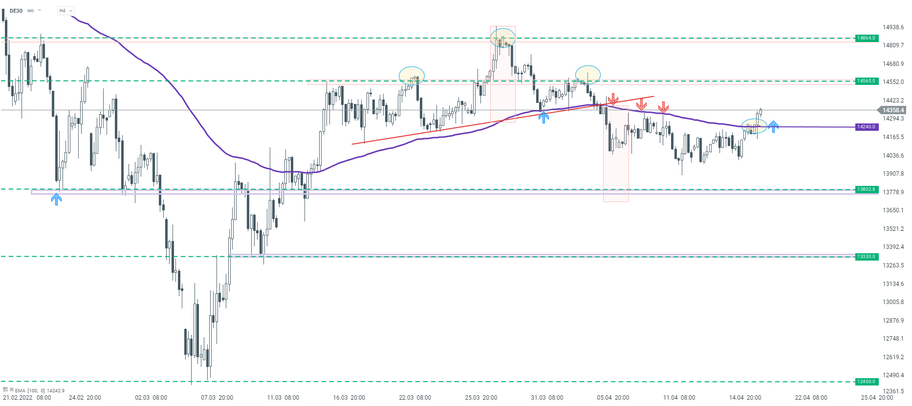 Nejprve se podívejme na německý index DAX (DE30). Při pohledu na interval H4 je vidět, že prodejci si neuvědomili učebnicový rozsah pohybu dolů, ke kterému došlo po proražení neckline formace Hlava a ramena. Navíc se cena vrátila nad klouzavý průměr za 100 období (fialová čára), což může naznačovat, že iniciativu převzali prodejci. V případě dalšího pohybu směrem nahoru se nejbližší cíl pro kupující nachází kolem zóny rezistence na 14 565 bodech, což se shoduje s rameny zmíněné formace Hlava ramena. Pokud by došlo k prolomení výše, další rezistence ke sledování leží na 14 865 bodech.