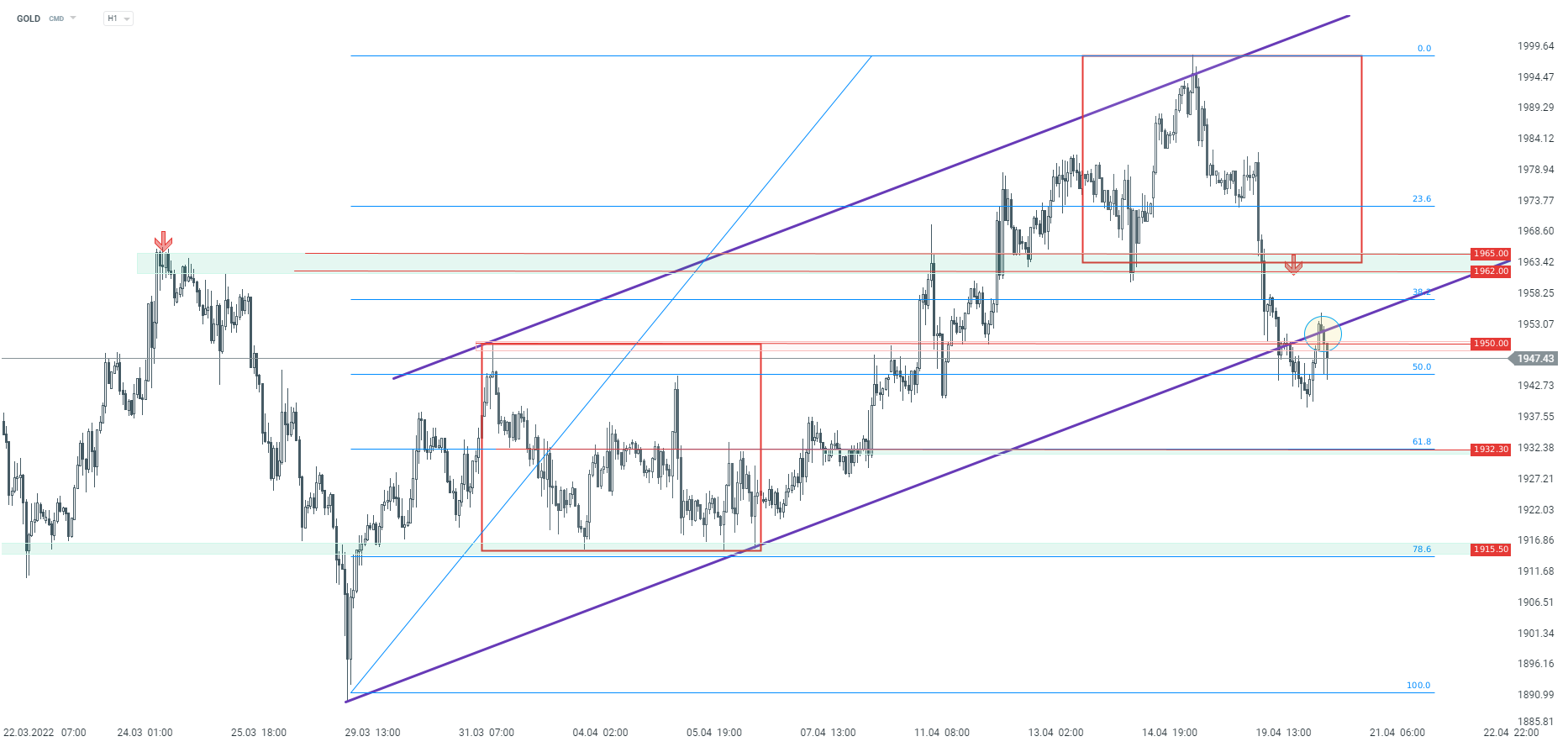 Při pohledu na graf zlata na intervalu H1 je vidět, že medvědi negovali spodní hranici struktury 1:1 a poté cena opustila vzestupný kanál. Během dnešní seance se kupující neúspěšně pokoušeli tlačit cenu nad spodní hranici kanálu. Zdá se, že prodejci mohou mít alespoň krátkodobě kontrolu. Pokud cena zůstane pod úrovní 1 950 $, je možné pokračování v pohybu níže. V takovém scénáři leží nejbližší support na 1 932,3 USD.