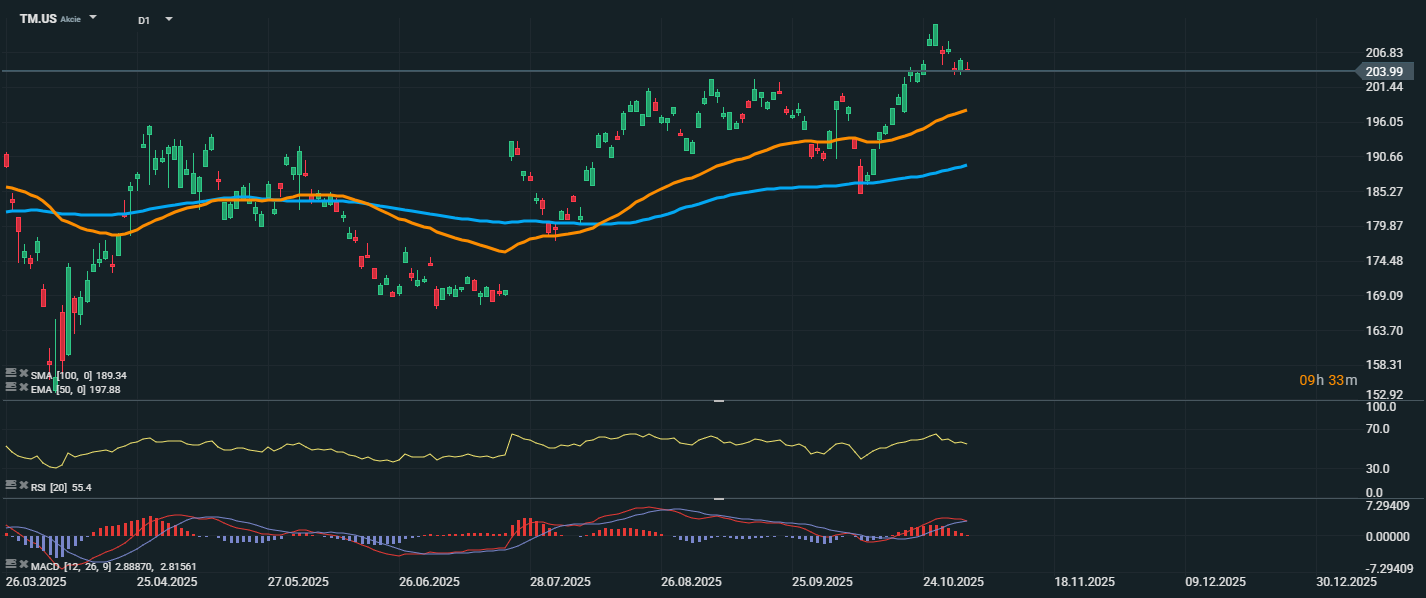 Akcie Toyota Motor se aktuálně obchodují na úrovni 203,99 USD, mírně pod nedávným maximem na úrovni 210 USD. Cena zůstává pevně nad klouzavými průměry EMA 50 (197,88 USD) a SMA 100 (189,34 USD), což potvrzuje býčí technické nastavení. RSI se nachází na hodnotě 55,4, tedy v neutrálně pozitivním pásmu, bez známek překoupení. Trh má tedy prostor pro další růst bez nutné korekce.