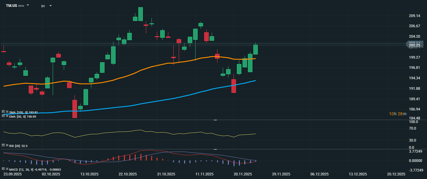 Toyota Motor zveřejnila, že její globální výroba v říjnu meziročně vzrostla o 4 % na 926 987 vozidel, čímž pokračovala v růstové sérii již pátý měsíc za sebou. Celosvětový prodej automobilky rovněž posílil, když dosáhl 922 087 vozů, tedy o 2 % více než loni. Největším tahounem růstu zůstává Spojené státy, kde Toyota těží ze silné poptávky po hybridních modelech.