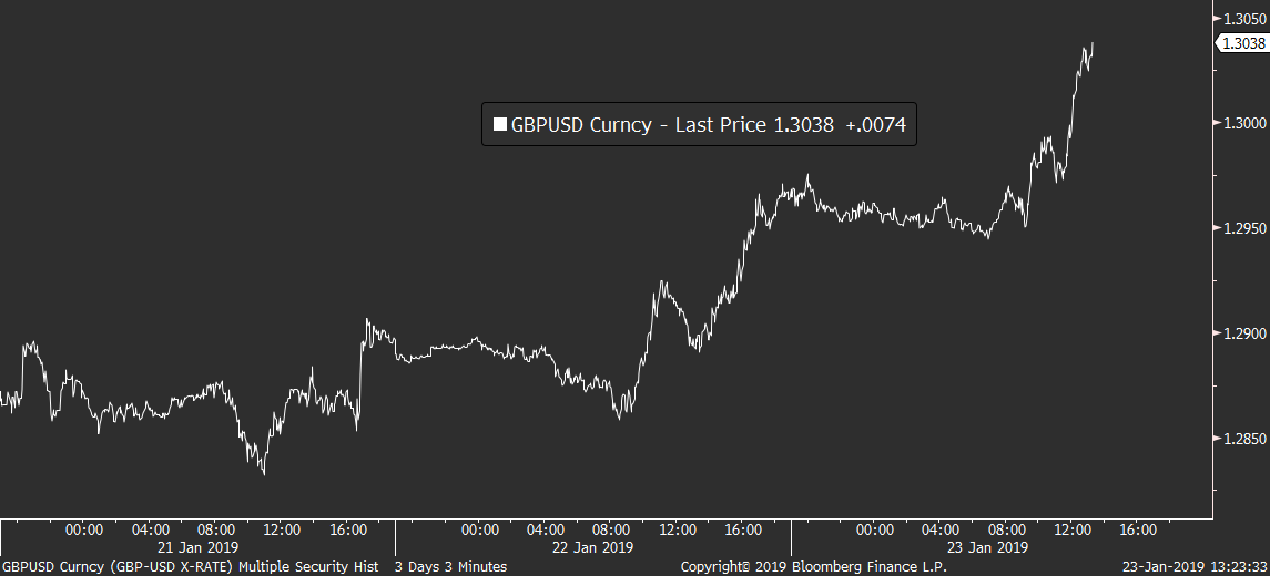 Dobré zprávy pro libru. Přesvědčení obchodníků, že se dočkáme prodloužení finálního termínu pro vystoupení Británie z EU zesiluje. Libře přitom pomáhají také zprávy o tom, že mezi poslanci roste podpora dodatku, o kterém by mělo být hlasováno v britském parlamentu a který by měl vylučovat možnost vystoupení Británie z EU bez dosažení dohody s EU. Po drtivé prohře, kterou utrpěla v minulém týdnu v parlamentu Theresa Mayová, se stává klíčovou pozice Labour party, která pro své návrhy počkat s brexitem získává podporu i mezi částí konzervativců.