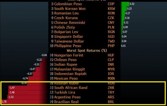 Témou číslo jeden ostáva vývoj mien rozvíjajúcich sa ekonomík na čele s tureckou lírou a argentínskym pesom. Predajný tlak pokračuje, hoci už nie je extrémny. Obe tieto meny dnes popoludní strácajú zhruba 1,5%, stiahli však so sebou aj ďalšie zraniteľné meny – brazílsky real a juhoafrický rand.