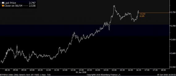 Výnosy z talianskych desaťročných dlhopisov poskočili o viac ako 20 bázických bodov nad úroveň 2,7%. To stiahlo nadol aj euro, EURUSD klesol k úrovni 1,165.
