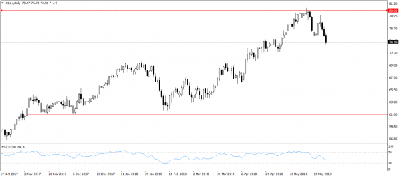 Ropa klesá tretí deň po sebe. Pokračuje uvoľnenie napätia, ktoré prišlo po nedávnom prehlásení Saudskej Arábie a OPECu, že sú pripravení vykryť výpadok ťažby z Iránu, ktorý sa onedlho dostane pod sankcie. Stále to však nie je úplne isté, bude potrebné kolektívne rozhodnutie na zasadnutí OPECu, Ruska a 10 ďalších exportérov na zasadnutí 22. júna. Ropa Brent sa dnes po mesiaci dostala k úrovni 74 dolárov za barel.