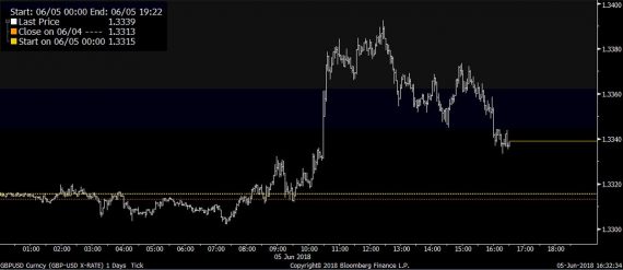 Najviac to pomohlo britskej libre, keďže index dôvery ukázal, že slabé HDP z prvého kvartálu by sa nemalo opakovať. GBPUSD poskočil z 1,333 až k 1,339. Popoludní však väčšinu ziskov vymazal. Jednak to bolo kvôli lepšiemu indexu dôvery v službách z USA, ktorý podporil dolár, a zároveň aj kvôli opätovnému rastu rizikových prirážok z Talianska, kde premiér Conte vo svojom prejave potvrdil pripravenosť novej koalície robiť radikálne kroky, ktoré pravdepodobne zvýšia deficit a dlh (hoci on sám to nepredpokladá, podľa neho by to mal vykompenzovať vyšší rast). Toto vyjadrenie prinieslo na trhy menšiu averziu k riziku, ktoré podporilo bezpečné meny (ako dolár) na úkor rizikovejších (ako libra).
