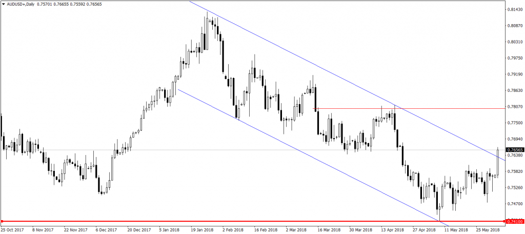 Na devízových trhoch upokojovanie situácie nepraje bezpečným menám ako doláru a jenu. Naopak, spomedzi najobchodovanejších mien sa darí vyššie úročeným pacifickým menám. A to najmä austrálskemu doláru, keďže dnes ráno z krajiny dorazili dve pozitívne čísla: 1) maloobchodné tržby rástli medzimesačne o 0,4% (čakal sa rast o 0,3%); 2) firemné zisky vzrástli medzikvartálne o 5,9% (čakal sa rast o 3,1%). AUDUSD dnes poskočil o viac ako percento a dostal sa k úrovni 0,765, čo predstavuje viac ako mesačné maximum. Pokiaľ si tieto zisky udrží do záveru obchodovania, tak to bude najvyšší jednodňový rast od júna 2017. AUDUSD dnes navyše prelomil hornú hranu klesajúceho trendového kanála, čo mu taktiež mohlo pomôcť k výraznému rastu.