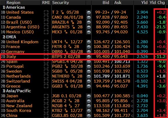 Napätie na trhoch po piatkovom vymenovaní vlády v Taliansku pokračuje v ústupe. Zažehnalo sa totiž riziko predčasných volieb, ktoré mohli byť podľa viacerých komentátorov referendom o eure. Nová vláda bude síce zrejme zvyšovať deficity a dlh, avšak pri garancii štátneho dlhu zo strany ECB by to nemalo výrazne zvýšiť riziko bankrotu. Vystúpenie Talianska z eurozóny by naopak znamenalo zaručený bankrot na zahraničné záväzky v eurách.