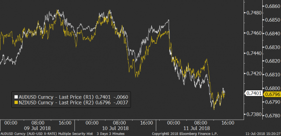 Na tradičních měnách je dnes o něco větší klid, když si zde obchodníci, stejně jako na indexech, zachovávají spíše chladnější hlavu. Zprávy z USA sice bezpečným přístavům (USD, JPY) pomáhají, například na páru s eurem či librou ale dolar nijak výrazně nezpevňuje. Největší zisky si tak americká měna opět připisuje vůči AUD a NZD, na které strach z obchodní války doléhá kvůli provázanosti tamních ekonomik s Čínou dvojnásob.