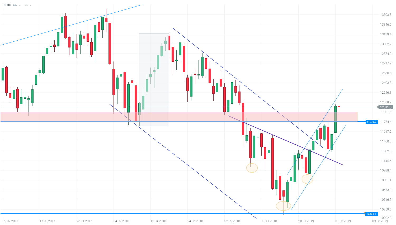 DE30 minulý měsíc začal ztrácet v reakci na velmi slabé výsledky PMI z Německa, ale i tak se dokázal udržet v silném rostoucím trendu poté, co pomohlo nové lepší makro z Číny a holubičí komentáře centrálních bankéřů. Tento týden budou výsledky německého PMI pro tento trh znovu klíčové, jelikož by bylo opravdu složité sloučit silný růst akcií s dalším signálem o možné recesi v Německu.