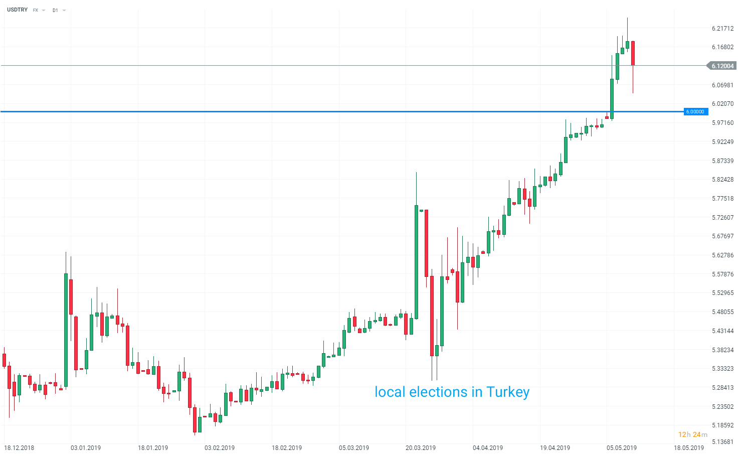 Posledních několik dnů přineslo na USDTRY prudké pohyby poté, co byly zrušeny výsledky voleb v Istanbulu, které se budou nově konat znovu v červenci. Centrální banka musela na volatilitu odpovědět „stínovým zvýšením sazeb“, když zrušila týdenní repo operace, které nabízejí pravidelnou nejlevnější TRY likviditu. To pomohlo stabilizovat TRY, ale na jak dlouho? To ukážou možná už nadcházející seance.
