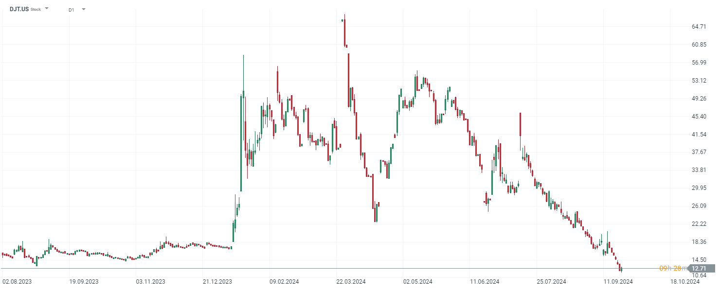 V květnu byl Trump shledán vinným z falšování obchodních záznamů, což vedlo k 5% poklesu akcií. Od svého burzovního debutu se akcie DJT propadly přibližně o 65 %.
