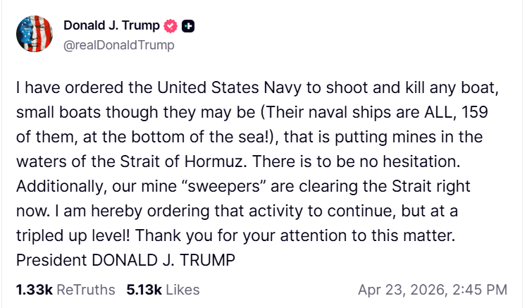 Americký prezident Donald Trump oznámil, že americké námořnictvo má bez váhání zasáhnout proti jakýmkoli lodím, které by v Hormuzském průlivu pokládaly námořní miny. Ve svém vyjádření zároveň uvedl, že Spojené státy výrazně zintenzivní operace zaměřené na čištění této strategicky důležité oblasti.