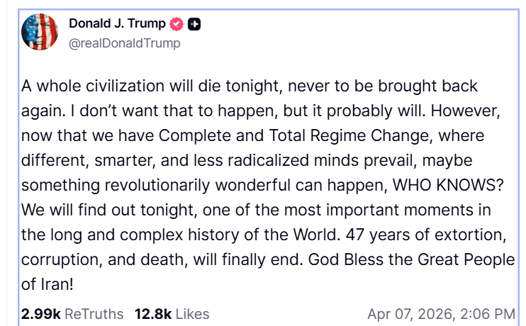 Donald Trump dnes ve svém novém komentáři výrazně přitvrdil a naznačil, že současná noc může být pro Írán i celý region zlomová. Ve svém příspěvku mluví o tom, že může „zemřít celá civilizace“, zároveň ale dodává, že po úplné změně režimu by se mohla otevřít cesta k novému vývoji. Jeho slova tak působí jako velmi tvrdý vzkaz nejen směrem k Teheránu, ale i k finančním trhům, které citlivě sledují každý posun kolem Hormuzského průlivu.