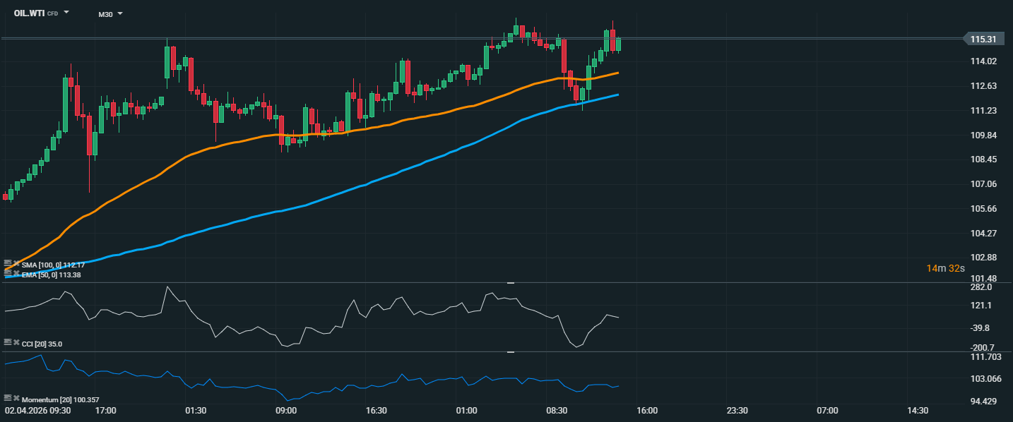 Cena ropy WTI se nyní drží v silném růstovém trendu a aktuálně se obchoduje kolem 115,31 USD. Trh se po krátké korekci rychle vrátil zpět k lokálním maximům, což potvrzuje, že kupci mají nadále navrch. Cena zůstává nad oběma klouzavými průměry, konkrétně nad EMA 50 na 113,38 USD i nad SMA 100 na 112,17 USD, což podporuje pokračování růstového nastavení. Krátkodobě je vidět, že ropa po předchozím výběru zisků našla podporu právě v blízkosti klouzavých průměrů a odtud znovu zamířila vzhůru. Aktuálně se tak trh vrací do zóny předchozích vrcholů, kde se bude rozhodovat, zda dojde k dalšímu průrazu, nebo naopak k dočasnému zastavení růstu. Pokud by se ceně podařilo udržet nad 115 USD, býčí momentum by mohlo pokračovat i do dalších seancí. CCI na 35,0 ukazuje spíše neutrální až mírně pozitivní nastavení, takže trh zatím nevypadá překoupeně. Momentum 100,36 se drží těsně nad neutrální hranicí, což značí, že růstová energie sice není extrémně silná, ale stále zůstává na straně kupců. Celkově tak ropa působí stabilně a technický obrázek zůstává býčí, dokud se cena drží nad oblastí kolem 113 až 112 USD.