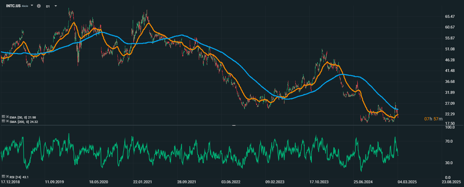 .Akcie Intel (INTC.US) byly v dlouhodobém klesajícím trendu od konce roku 2021, kdy se obchodovaly nad 50 USD, až na nedávné minimum pod 20 USD. Momentálně se cena pohybuje kolem 22,29 USD a dochází k prvnímu pokusu o růst po období výrazného poklesu.
