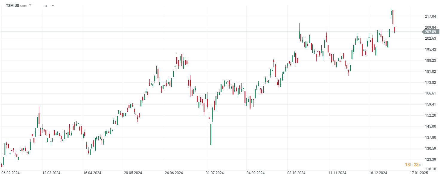 V prosinci společnost TSMC zaznamenala 57,8% nárůst tržeb na 278,16 miliardy TWD. Akcie společnosti v roce 2024 vzrostly o 81 %, přičemž širší trh posílil o 28,5 %. Kompletní výsledky za čtvrté čtvrtletí budou zveřejněny 16. ledna. Akcie v předobchodní fázi obchodování po oznámení vzrostly přibližně o 1,4 % a prolomily hranici 210 USD za akcii.
