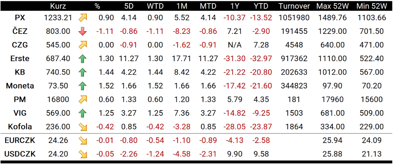 Nejziskovějším titulem pražského indexu se dnes stala Moneta (MONET.CZ), jež si připsala 1,52 % a seanci zakončila na 73,50 Kč za akcii. Získaly i ostatní banky, Komerční banka (KOMB.CZ) vzrostla o 1,44 % a Erste (RBAG.CZ) uzavřela o 1,30 % výše na 687,40 Kč. Energetická skupina ČEZ (CEZ1.CZ) se dnes propadla o 1,11 % a uzavřela na 803 Kč za akcii.