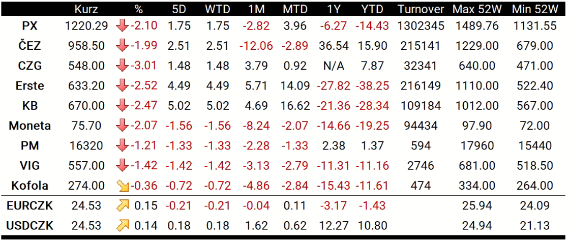 Kurzy indexu PX a jednotlivých akcií po uzavření BCPP v pátek 16.9.2022. Zdroj: Bloomberg