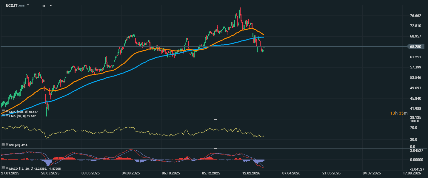 Akcie UniCredit se obchodují kolem 65,25 EUR a v posledních týdnech prošly výraznější korekcí po předchozím silném růstu. Cena se aktuálně nachází pod EMA 50 na úrovni 69,54 EUR a zároveň i pod SMA 100 kolem 68,65 EUR, což ukazuje na zhoršené krátkodobé technické nastavení. Po prudším poklesu sice přišel odraz ode dna, ten ale zatím nepůsobí dostatečně silně, aby změnil celkový opatrný výhled. RSI se pohybuje poblíž hodnoty 42,4, tedy pod neutrální zónou, což naznačuje přetrvávající slabší momentum, ale zatím bez známek výrazné přeprodanosti. Pro potvrzení lepší nálady by bylo potřeba návrat ceny nad pásmo kolem 68,6 až 69,5 EUR. Z pohledu supportů je důležitá oblast kolem 63 EUR, kde se akcie v posledních dnech snažily stabilizovat. Pokud by tato zóna nevydržela, trh by mohl zamířit ještě níže. Naopak úspěšné překonání klouzavých průměrů by mohlo otevřít prostor pro návrat k vyšším úrovním a částečné uklidnění současné korekce.