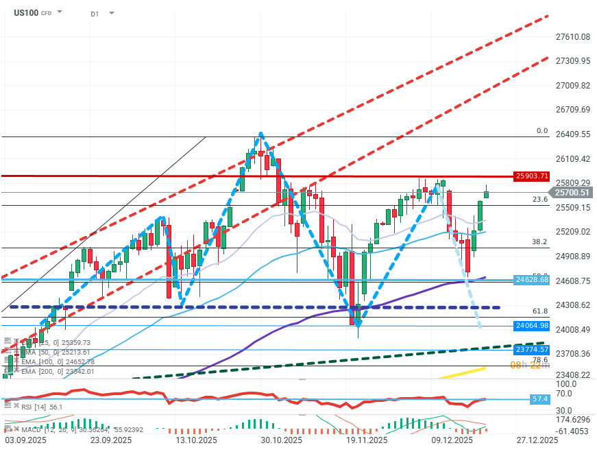 Kupci dokázali prorazit formaci RGR, přičemž uhájili úroveň FIBO 50 a průměr EMA100. Dalším cílem je oblast okolo 25 900 bodů, kterou je třeba překonat pro pokus o otestování historických maxim na grafu. Pokud chce nabídka znovu převzít iniciativu, je nutný rychlý návrat pod úroveň FIBO 38,2, odkud by mohlo dojít k proražení EMA100 a prohloubení korekce.