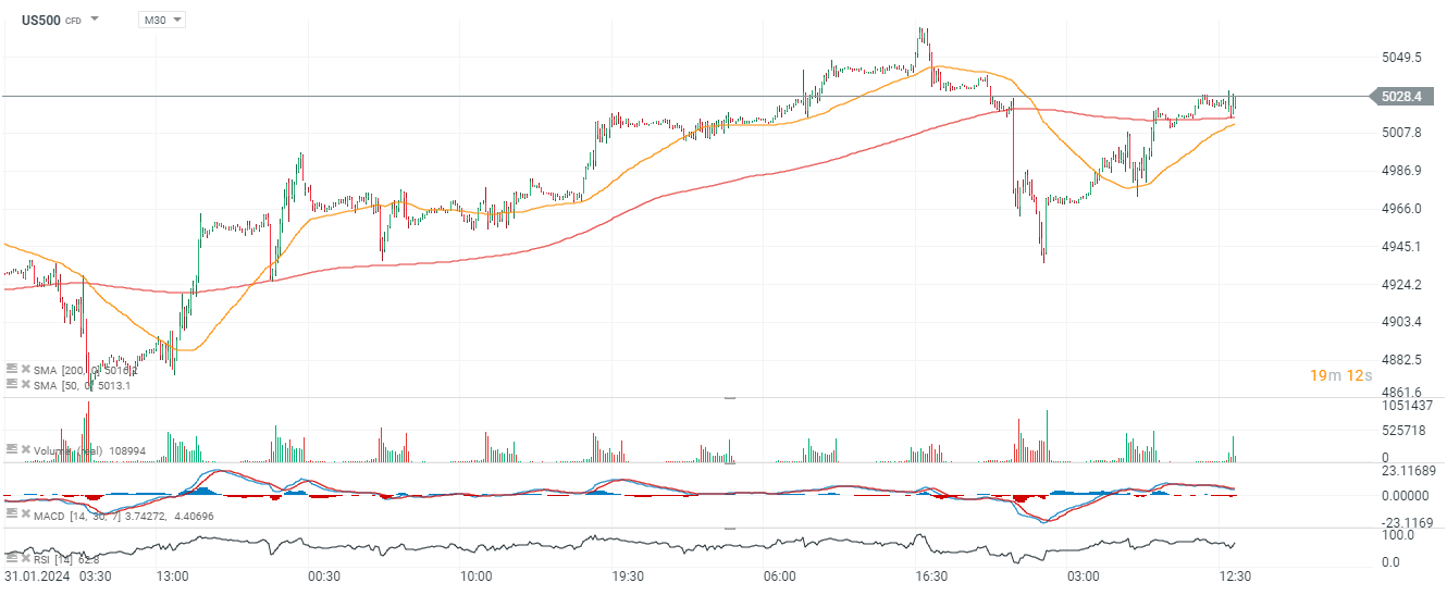 Americké indexy se dnes snaží odrazit a US500 zastavil pokles na úrovni SMA200, na intervalu M30, jak bylo dříve vidět 2. února. Půlhodinové svíčky také ukazují, že objem kupujících je dominantní a vzestupný trend se udržuje . Trh čeká především na výsledky Nvidie (21. února po seanci)
