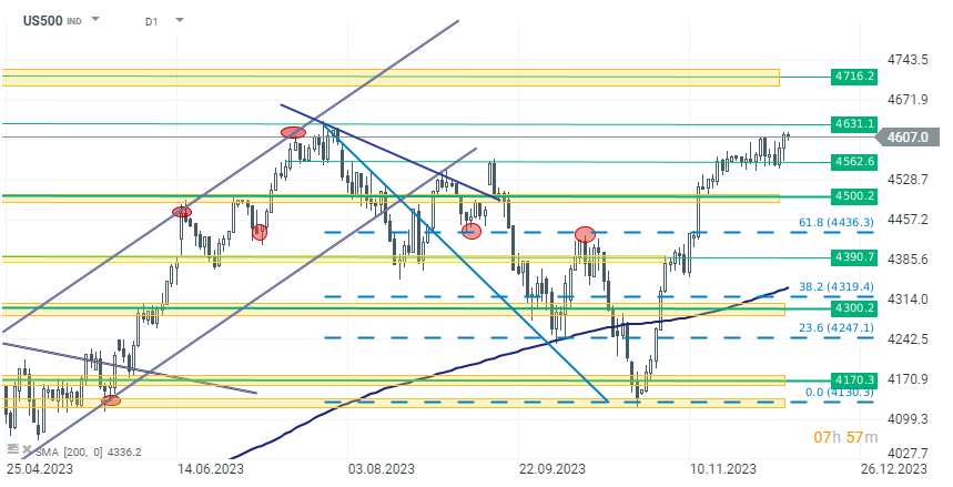 US500 zůstává od konce listopadu v konsolidačním pásmu nad 4560 body. I přes nedávný dynamický růst se index blíží svému ročnímu maximu 4630 bodů.