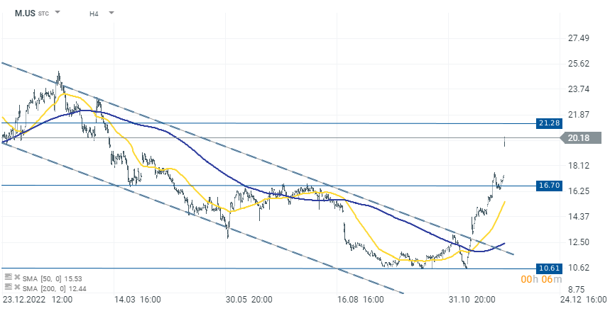 Macy's (M.US) získává více než 20 % na otevřeném trhu po údajné nabídce odkupu ve výši 5,8 miliardy USD od společností Arkhouse Management a Brigade Capital Management, což společnost oceňuje na přibližně 21 USD za akcii, což je 32,4% prémie oproti závěrečné ceně z 30. listopadu Společnost Macy's, známá svými cennými nemovitostmi, včetně ikonické lokality Herald Square v New Yorku, je v současné době na vrcholu prázdnin a připravuje se na změnu generálního ředitele v roce 2024.