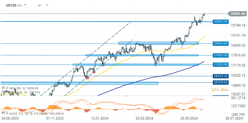 Index technologických společností (US100) po krátké konsolidaci na úrovni 20000 bodů opět roste. US100 dnes posiluje o 0,70 % nad úroveň 20500 bodů. Za růstem stojí především největší společnosti, mezi něž patří Amazon, Google a Meta Platforms.