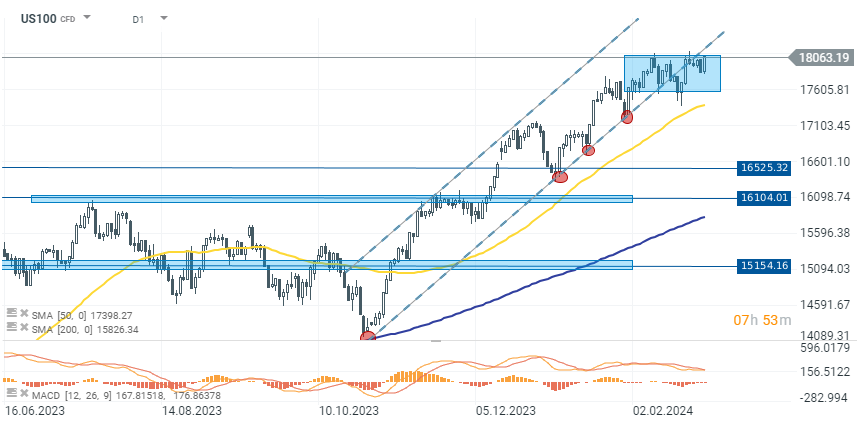 Čtvrtý obchodní den tohoto týdne Wall Street rozšiřuje své zisky po zveřejnění zprávy o inflaci PCE. Index US500 vzrostl o více než 0,64 % a přiblížil se svému historickému maximu nad 5 100 bodů. Podobný vývoj vykazuje i technologický index Nasdaq100, který posiluje o více než 1,05 % a překonává tak hranici 18 000 bodů. Za těmito růsty stojí oslabující dolar a klesající výnosy desetiletých amerických státních dluhopisů, které nyní dosahují 4,23 %.