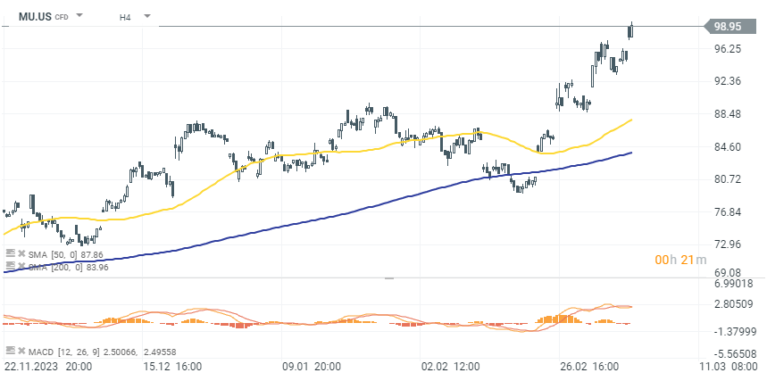 Micron (MU.US) si rovněž připisuje více než 4,00% zisky po zvýšení ratingu od společnosti Stifel, která se odvolává na podhodnocené projekce pro rok 2025.