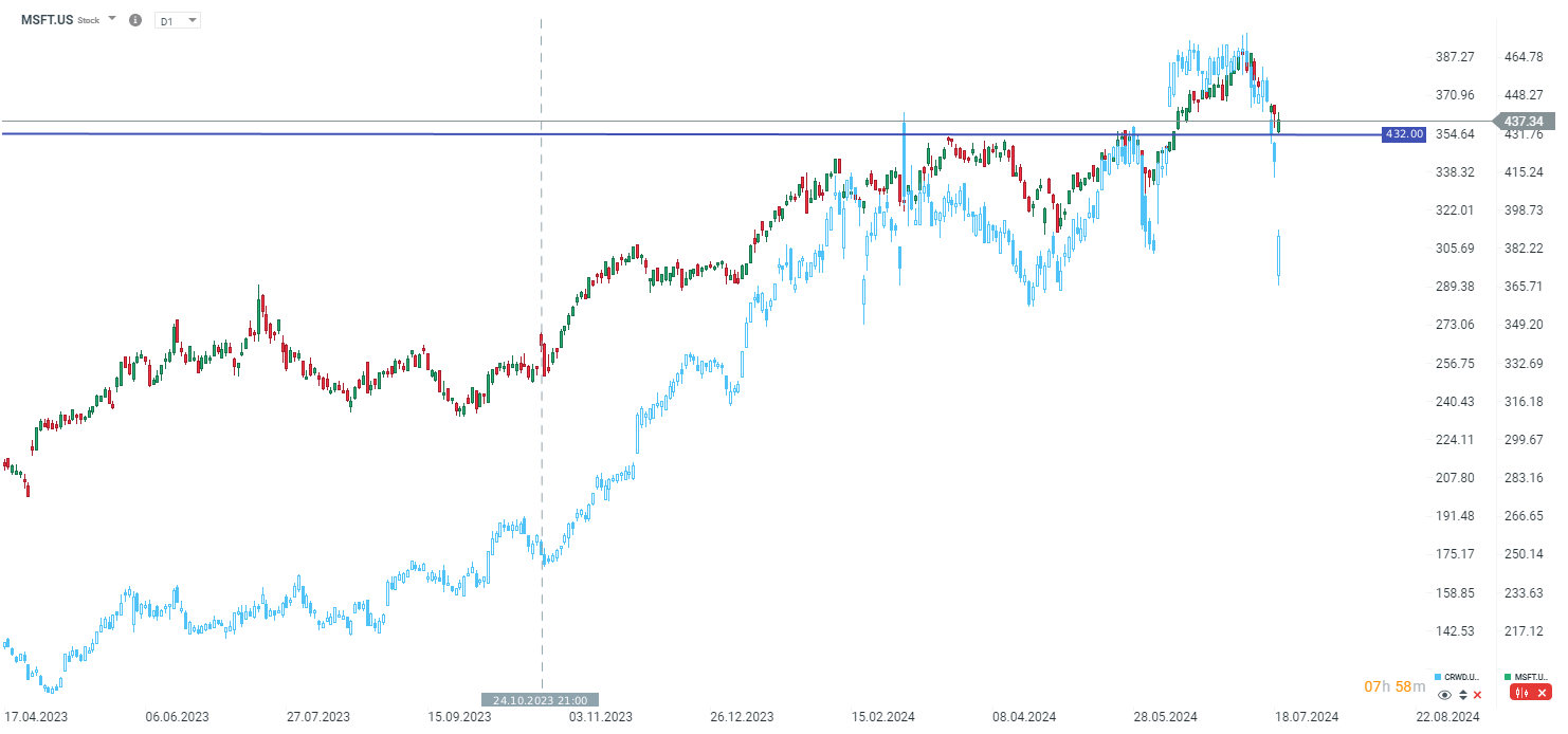 Microsoft omezuje téměř všechny své ztráty od začátku seance a reaguje na velmi důležitou podporu blízko 432 dolarů za akcii. Odrážejí se také akcie Crowdstrike, které se vracejí nad 300 USD na akcii. Zdroj: xStation5