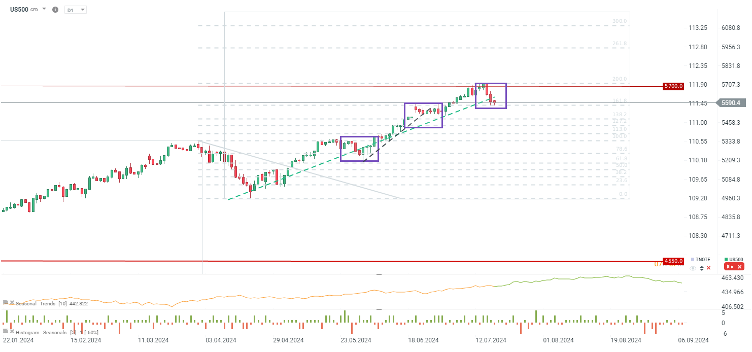 Futures na S&P 500 (US500) rostou téměř k úrovni 5600 bodů a reagují na podporu 5575 bodů. Za zmínku stojí, že je zachováno i rozpětí největší korekce trendu, která začala v druhé polovině dubna. Zdroj: xStation5