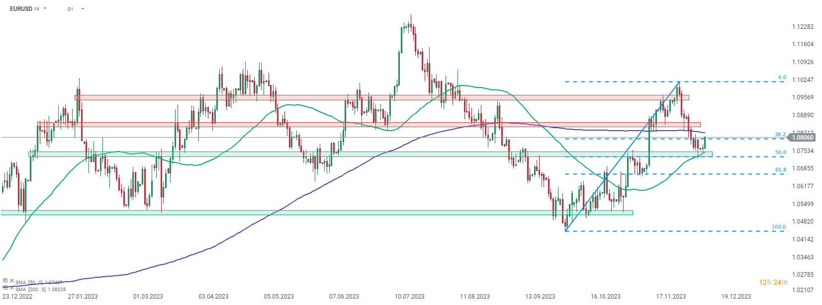 Americký dolar v poslední době výrazně posílil vůči euru. Poklesy EURUSD však byly v prosinci zastaveny v zóně odporu, označené klouzavým průměrem 50 sezení (zelená čára) a 50% návratem pohybu nahoru, který byl zahájen na začátku 3. čtvrtletí 2023. Pár se pokouší prolomit nad 38,2 % retracement dnes. Pokud se nad touto překážkou dočkáme prolomení, býci budou téměř okamžitě čelit další – klouzavý průměr 200 sezení (fialová čára).