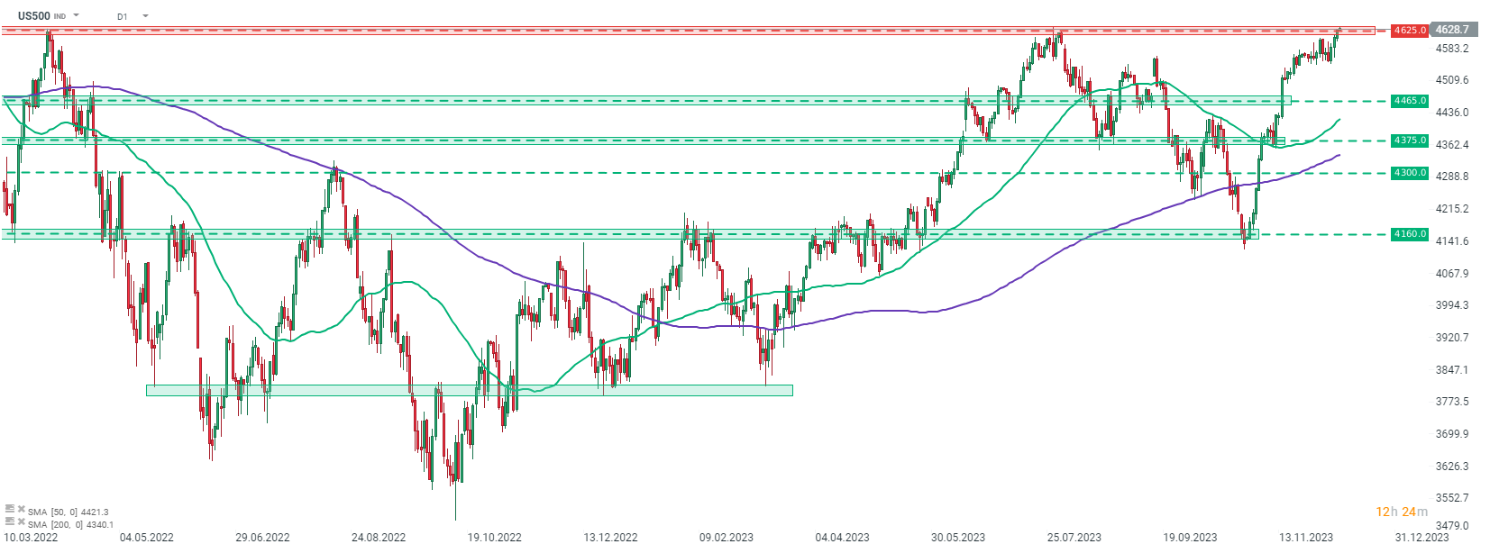 Futures na S&P 500 (US500) po krátkém období bočního obchodování na přelomu listopadu a prosince 2023 znovu vzrostly. Index se pokouší prolomit nad zónou rezistence 4 625 bodů, označenou místními maximy z července 2023 a března 2022. Pohyb hodnoty nad 4 635 bodů by znamenala, že se index obchoduje na nejvyšší úrovni od poloviny ledna 2022. Nižší než očekávaná hodnota inflace v USA by mohla akciím vzpružit a potenciálně by se US500 posunulo na 23měsíční maximum!